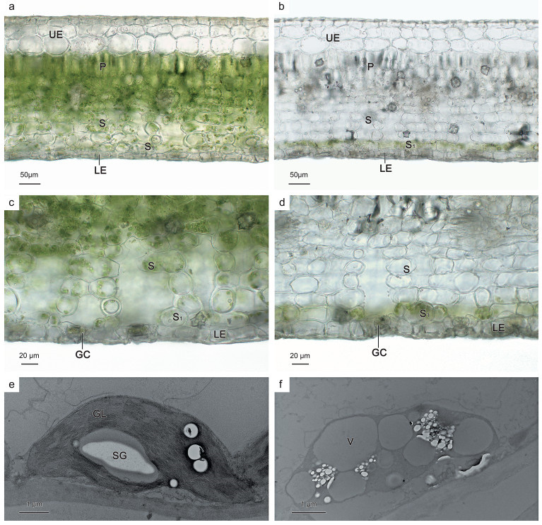 | Fig. 5 Microscopic and ultrastructure observations of green and albino sectors of Heptapleurum ellipticum. Shown are the transverse structures of green (a, c) and albino (b, d) sectors under an optical microscope, and the ultrastructure of plastids in green (e) and albino (f) mesophylls under a TEM. UE, upper epidermis; LE, lower epidermis; P, palisade mesophyll; S, spongy mesophyll; S1, first layer of spongy mesophyll; GC, guard cell; GL, grana lamellae; SG, starch granule; V, plastid vacuolated bodies. |
