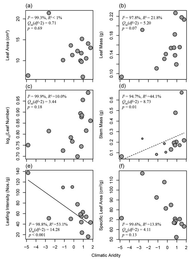 As climatic aridity (i.e., low precipitation, high potential evapotranspiration and high vapor pressure deficit, Fig. S2) increased, leaf area and mass showed no significant change (Fig. 1a and b). Leaf number did not vary with climatic aridity, but stem mass increased marginally (Fig. 1c and d). Leafing intensity decreased significantly under drier climates (Fig. 1e). Although specific leaf area showed an apparently decreasing trend as climatic aridity increased, the trend was not significant (Fig. 1f).