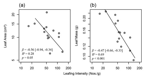 Mean leaf size in terms of either area or mass was negatively correlated with mean leafing intensity across habitats (Fig. 2). Leaf mass showed a stronger correlation with leafing intensity than leaf area (Fig. 2a vs. 2b). In individual habitats, both leaf area and mass were also negatively correlated with leafing intensity (Fig. 3a and c, Fig. S3). The habitat-specific coefficients of correlation between leaf area and leafing intensity averaged −0.58 (95%CI = [−0.66, −0.48], Fig. S3), and there were slightly stronger correlations between leaf mass and leafing intensity with a mean coefficient of −0.66 (95%CI = [−0.74, −0.56], Fig. S3).