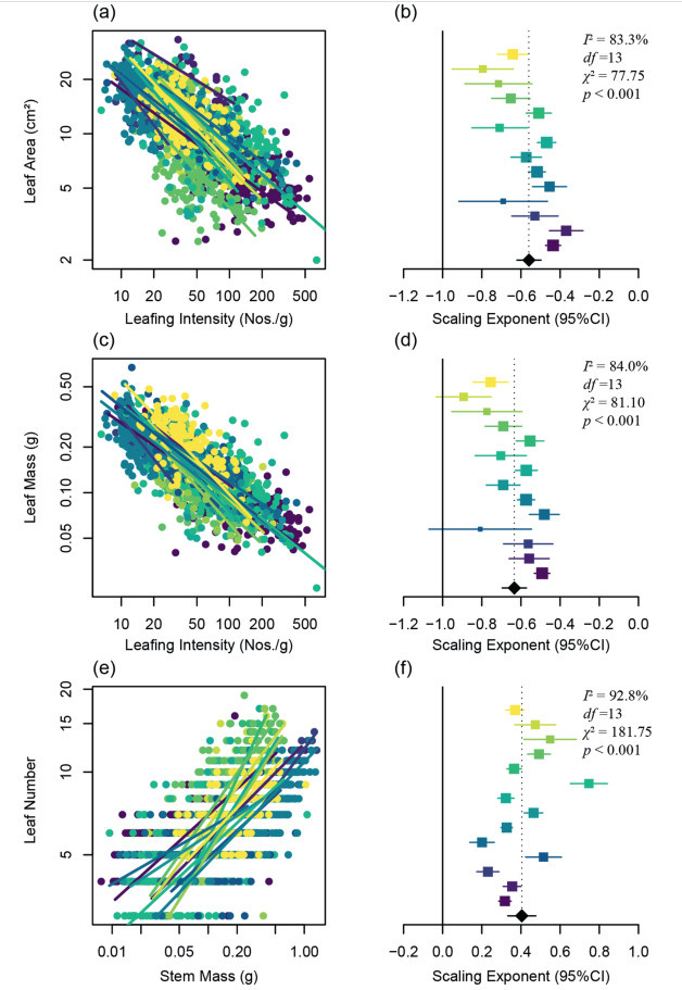 Fig. 3 Habitat-specific and aggregated scaling relationships between foliage deployments traits of Populus euphratica. The three scatter plots (a, c, e) on the left show the distribution of individual traits and the standardized major axis lines, and the three forest plots (b, d, f) on the right show the central tendency and spread of site-specific scaling exponents. The color scale from yellow to purple represents a decreasing gradient of climatic aridity. The colored squares (![]() |