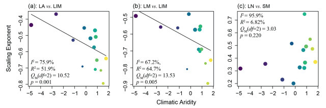 | Fig. 4 The shifts of scaling exponents for leaf size vs leafing intensity (a, b) and for leaf number vs. stem mass (c) in Populus euphratica along the gradient of climatic aridity. For the interpretation of the statistics, see Fig. 1. |