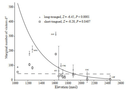 | Fig. 1 Correlations between the adjusted visitation frequency of long- and short-tongued pollinators (model-estimated marginal means ± SE) and population elevation. The dashed line represents the fitted results from negative binomial regression models. |