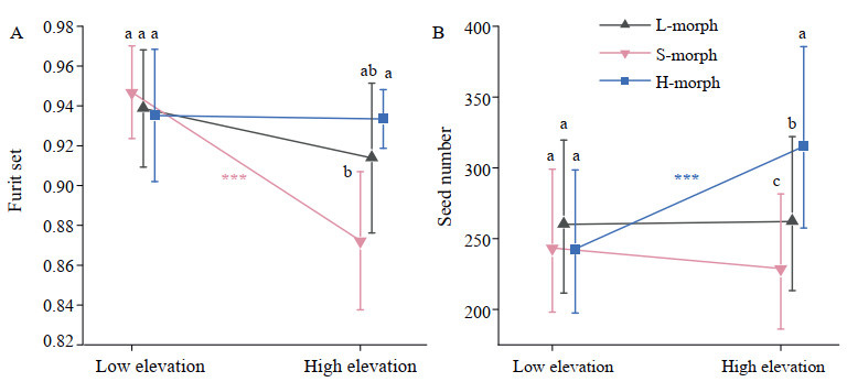 | Fig. 2 Variation in the mean (±SE) fruit set (A) and seed number (B) among the three floral morphs in low- and high-elevation habitats (averaged over populations). The data for (A) and (B) follow the Gaussian and Conway–Maxwell–Poisson distributions, respectively. Within each habitat, floral morph means with different lowercase letters differ statistically (Dunn–Šidák procedure). Colored lines indicate comparisons of each floral morph between habitats. Statistical significance is indicated as follows: *P < 0.05 and ***P < 0.001. |
