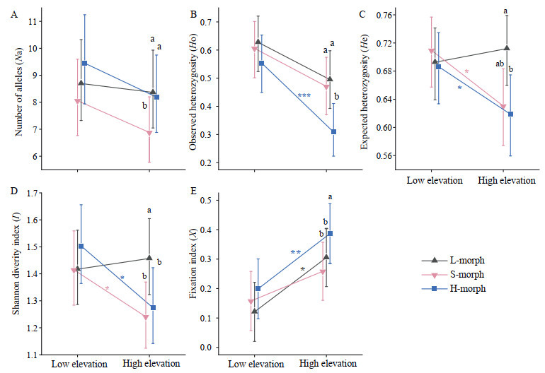 We analyzed 2932 offspring and amplified 6–28 alleles for 11 SSR markers, with an average of 16.6 ± 2. Populations XXC and LDP, which were at higher elevations, exhibited the lowest HO, HE, and I values (Table S4). The F values were greater than zero for all populations (Table S4), indicating inbreeding in all of these populations. In low-elevation habitats, there were no differences in these genetic parameters among the three floral morphs (Fig. 3). However, in high-elevation habitats, HO, HE, and I were significantly lower in the H morph than in the L and S morphs (Fig. 3). In progeny produced by S morphs, the genetic diversity decreased with the increase in elevation (Fig. 3).