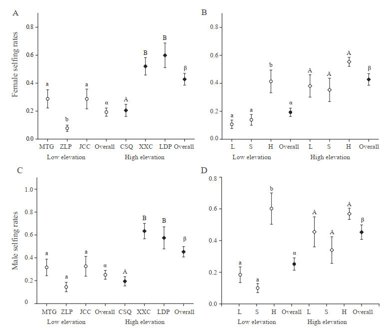 | Fig. 4 Mean (±SE) variation in female (A, B) and male selfing rates (C, D) across populations and flower morphs in low- and high-elevation habitats. (A) Female selfing rates among three low- and three high-elevation populations. (B) Female selfing rates among the three floral morphs, averaged across populations, in two habitat types. (C) Male selfing rates among three low- and three high-elevation populations. (D) Male selfing rates among the three floral morphs, averaged across populations, in two habitat types. Different lowercase and uppercase letters represent significant differences within low- and high-elevation habitats, respectively, and Greek letters indicate significant differences between low- and high-elevation habitats. Statistical tests were performed using the Dunn–Šidák correction. Data are presented as means ± standard errors. |