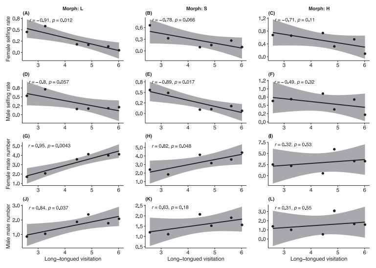 | Fig. 5 Relationships between mating patterns and visitation frequency of long-tongued pollinators across floral morphs. Panels show Pearson's correlations between long-tongued pollinator visitation (x-axis) and the female selfing rate (A–C), male selfing rate (D–F), number of female mates (G–I), and number of male mates (J–L) for each floral morph. Panels on the left, middle, and right correspond to L, S, and H morphs, respectively. Each plot includes the linear regression line with the 95% confidence interval, along with the Pearson correlation coefficient (r) and associated p-value. |