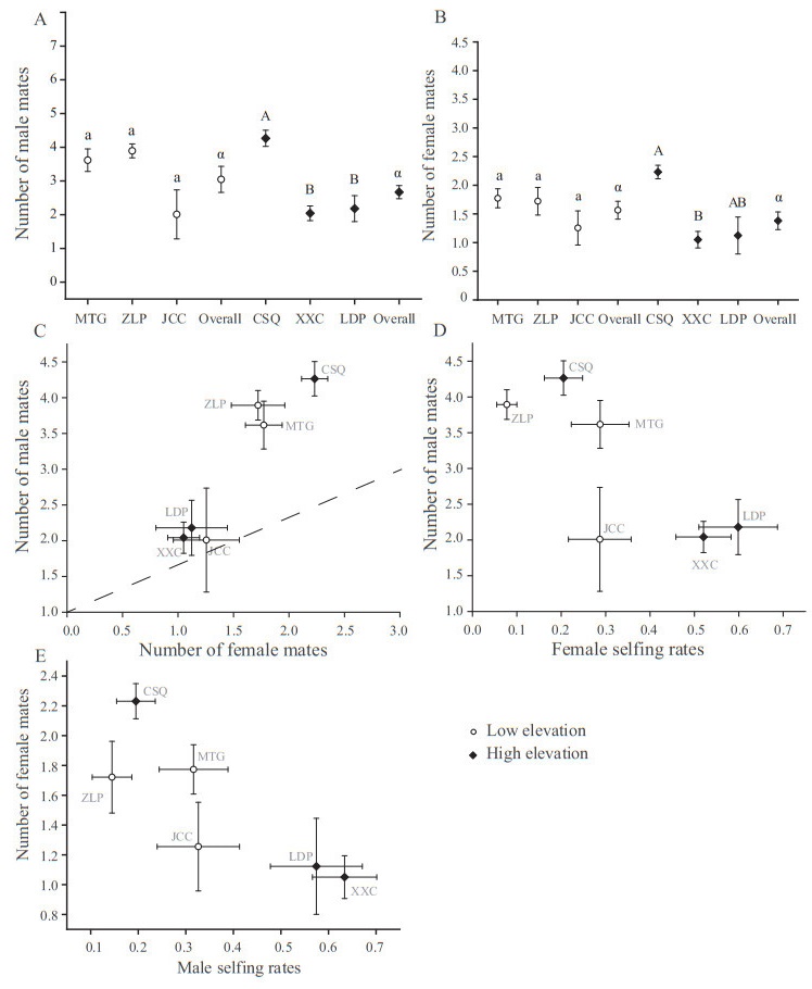 | Fig. 6 Variation in the number of male mates (A) and female mates (B) among the outcrossed seeds genotyped from maternal plants in the six experimental populations. Different lowercase and uppercase letters indicate significant differences within the three low- and three high-elevation populations, respectively, and Greek letters indicate significant differences between low- and high-elevation habitats (Dunn–Šidák procedure). (C) Relationship between the number of male mates and population mean female mates. (D) Relationship between the number of male mates and population mean female selfing rates. (E) Relationship between the number of female mates and population mean male selfing rates. All data are presented as means ± standard errors. |