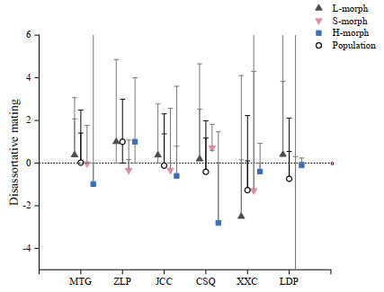 | Fig. 7 Variation in female disassortative mating (mean ± 95% CI) among populations and morphs. The dashed line indicates random mating. Cases with confidence intervals completely above the dashed line involved excess disassortative mating, whereas those completely below the dashed line involved excess assortative mating. |