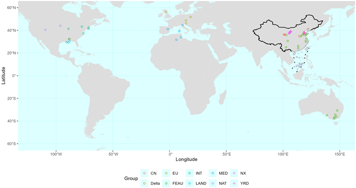 | Fig. 1 Sampling locations of Phragmites australis in the field survey (plus signs) and the common garden (circles). Colors indicate different lineages/groups: the European lineage (EU, and its invaded population in North America named INT), the Mediterranean lineage (MED, and its invaded population in North America named Delta), the native lineage in North American (NAT), the land ecotype along Gulf of Mexico (LAND), the east Asian and Australian lineage (FEAU), the Chinese lineage (CN), the Ningxia Plain population (NX) in western China, and the Yellow River Delta population (YRD) in eastern China. Details on sample distribution in NX and YRD can be found in Liu et al. (2021b). |
