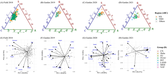 | Fig. 2 The CSR ternary diagrams (A–D) and PCA plots (E–H) of Phragmites australis in the field and the common gardens. NX denotes the Ningxia Plain in western China, and YRD denotes the Yellow River Delta in eastern China. LA, leaf area; LDMC, leaf dry matter content; SLA, specific leaf area; NN, node number; LL, leaf length; LW, leaf width; LT, leaf thickness; E, transpiration rate; A, photosynthetic rate; PN, panicle number. |
