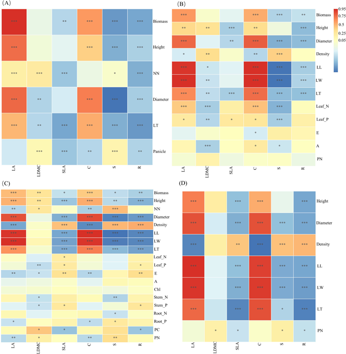 | Fig. 3 Pearson correlations between CSR scores and functional traits in the field (A) and common gardens (B, 2019; C, 2020; D, 2021). The color denotes r values (the red denotes positive correlation, while the blue denotes negative correlations), and the asterisk denotes the significance (∗p < 0.05; ∗∗p < 0.01; ∗∗∗p < 0.001). LA, leaf area; LDMC, leaf dry matter content; SLA, specific leaf area; NN, node number; LL, leaf length; LW, leaf width; LT, leaf thickness; density, shoot number; E, transpiration rate; A, photosynthetic rate; PC, panicle color; PN, panicle number. |