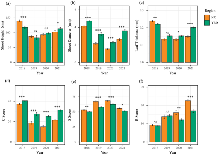 | Fig. 4 The comparisons of the functional traits and CSR scores between the eastern (YRD) and western (NX) populations of China. The asterisk denotes the significance of the t test (∗p < 0.05; ∗∗p < 0.01; ∗∗∗p < 0.001). |