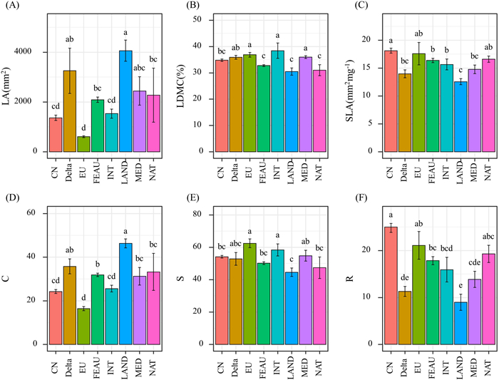 | Fig. 5 Comparisons of functional traits and CSR scores between different phylogeographical groups. Different letters mean the significant difference between groups based on Kruskal–Wallis tests (p < 0.05). |