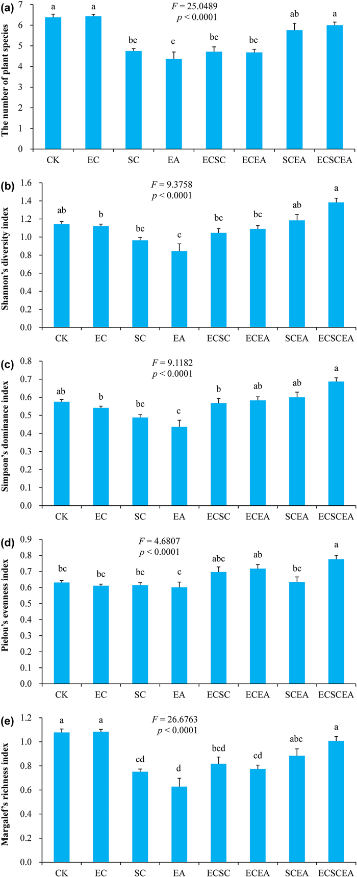 | Fig. 1 Differences in plant taxonomic diversity indices under different invasion scenarios. (a) Number of plant species; (b) Shannon's diversity index; (c) Simpson's dominance index; (d) Pielou's evenness index; (e) Margalef's richness index. Data (means ± SE). Different letters indicate statistically significant differences at 0.05 probability. Abbreviations: CK, the control (without invasion) (n = 221); EC, the invasion of Erigeron canadensis (n = 275); SC, the invasion of Solidago canadensis (n = 237); EA, the invasion of E. annuus (n = 51); ECSC, the co-invasion of E. canadensis and S. canadensis (n = 28); ECEA, the co-invasion of E. canadensis and E. annuus (n = 28); SCEA, the co-invasion of S. canadensis and E. annuus (n = 42); ECSCEA, the co-invasion of E. canadensis, S. canadensis, and E. annuus (n = 31). |