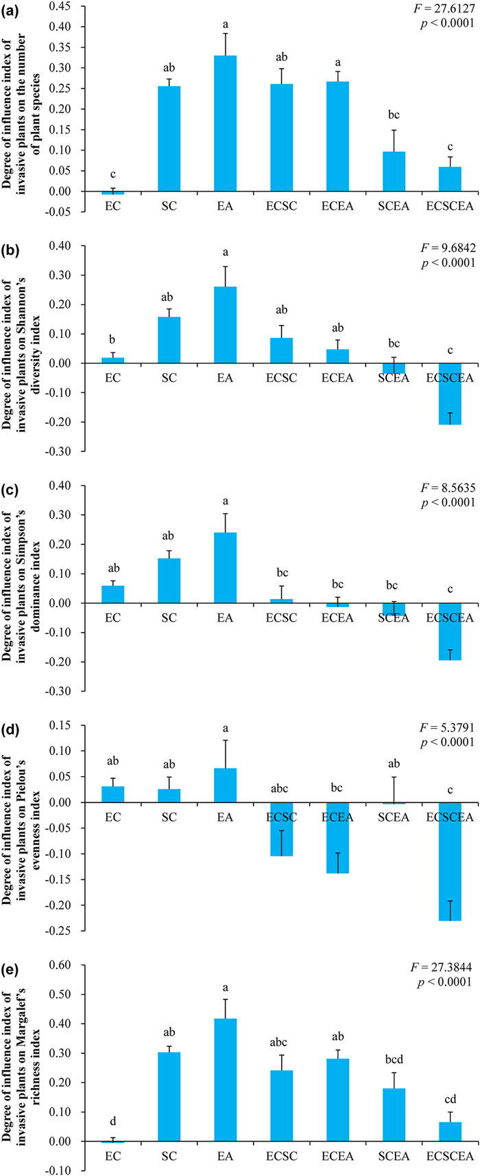 | Fig. 2 Differences in the degree of influence index of invasive alien plants on plant taxonomic diversity in invaded communities. (a) Degree of influence index of invasive alien plants on the number of plant species. (b) Degree of influence index of invasive alien plants on the Shannon's diversity index. (c) Degree of influence index of invasive alien plants on the Simpson's dominance index. (d) Degree of influence index of invasive alien plants on the Pielou's evenness index (e) Degree of influence index of invasive alien plants on the Margalef's richness index. Data (means ± SE). Different letters indicate statistically significant differences at 0.05 probability. Abbreviations same as in Fig. 1. |
