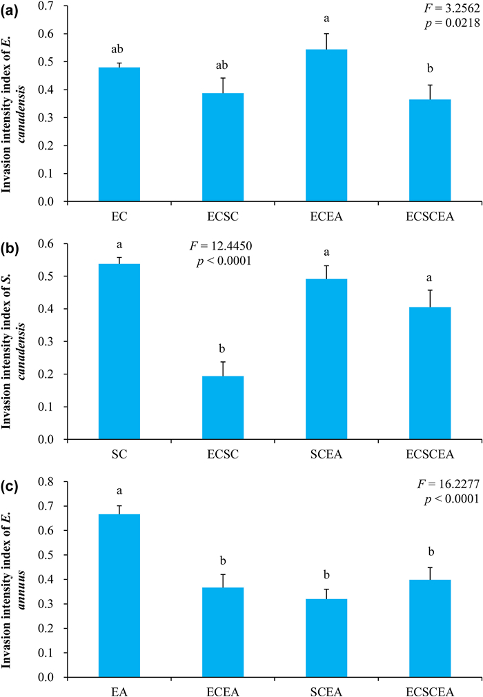 | Fig. 4 Differences in the invasion intensity index of invasive alien plants in the invaded communities (a) invasion intensity index of Erigeron canadensis; (b) invasion intensity index of Solidago canadensis; (c) invasion intensity index of E. annuus. Data (means ± SE). Different letters indicate statistically significant differences at 0.05 probability. Abbreviations same as in Fig. 1. |
