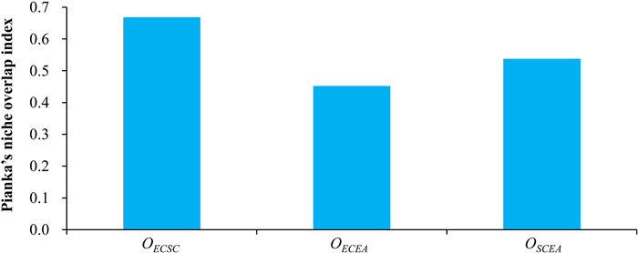 | Fig. 5 Differences in the Pianka's niche overlap index under co-invasion of Erigeron canadensis, Solidago canadensis, and E. annuus. Abbreviations: OECSC, the Pianka's niche overlap index between E. canadensis and S. canadensis; OECEA, the Pianka's niche overlap index between E. canadensis and E. annuus; OSCEA, the Pianka's niche overlap index between S. canadensis and E. annuus. |