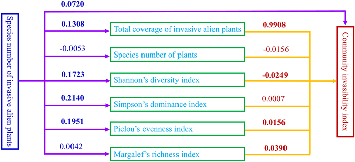 Path analysis based on the path coefficient (i.e., the standardized regression coefficient) was used to examine the influences of species number of IAS on total coverage, plant taxonomic diversity, and community invasibility, as well as the influences of the total coverage of IAS and plant taxonomic diversity on community invasibility in the invaded plots.