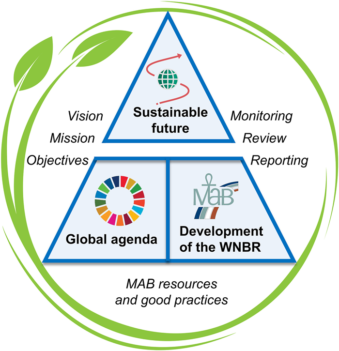 | Fig. 1 The key elements of UNESCO MAB Hangzhou Strategic Action Plan. The core area comprises three components of the action targets, which are guided by the vision, mission, and objectives of the Action Plan. Monitoring, review, and reporting play a crucial role in ensuring its effective implementation. Moreover, the MAB's resources and best practices—including the WNBR and its associated infrastructures, as well as knowledge, institutional and technical achievements—serve as an invaluable foundation for the Action Plan's success. |