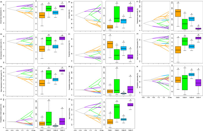 Fig. 5 Ecological niche evolution in Uncaria. Ancestral niche breadth reconstruction and niche breadth comparison (A–K) of 11 factors for Uncaria. These factors were selected from 27 factors by comparing their niche breadths among four clades using Turkey HSD, with significant differences at the P < 0.05 level. Colours represent the four clades of this genus. |