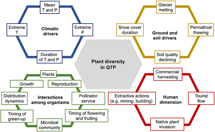 | Fig. 1 Global climate change and its targets interact to affect plant diversity in QTP. These factors are not exhaustive, but illustrate a wide spectrum of potential actions. T: temperature; P: precipitation. |
