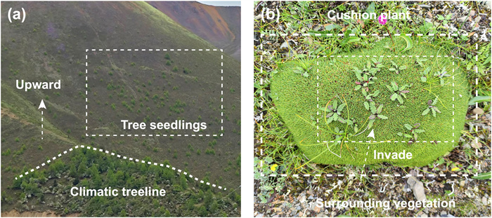 | Fig. 4 Potential consequences of native plant invasions. (a) Treeline upward shift and (b) degradation of cushion plants. |