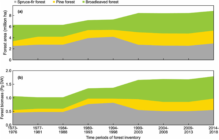| Fig. 1 Variation in area (a) and biomass (b) of spruce-fir, pine and broadleaved forests from 1973 to 2018. Data are shown with a five-year resolution. |