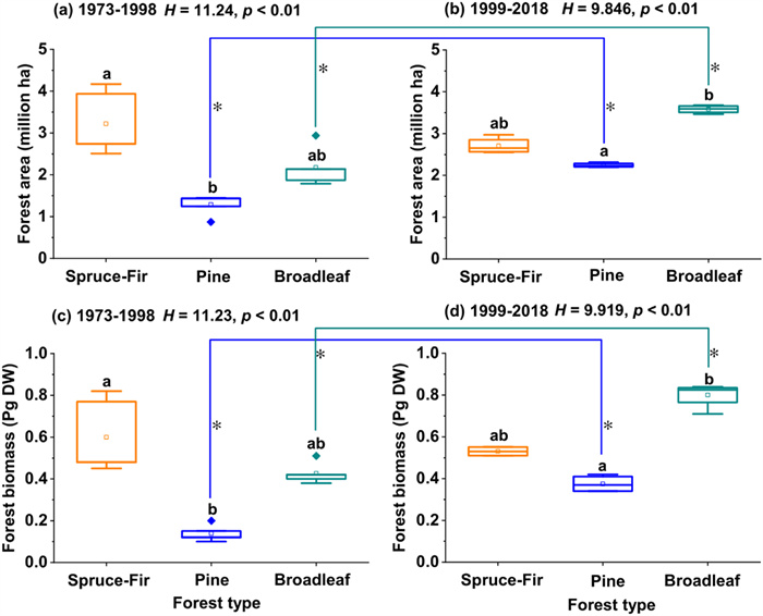 | Fig. 2 Comparisons of area (a, b) and biomass (c, d) in spruce-fir, pine and broadleaved forests between 1973–1998 and 1999–2018. The results of Kruskal–Wallis test between different forest types within each period are shown at the top of panel. Different letters indicate significant differences (p < 0.05) between forest types within each panel by using pair-wise post-hoc Dunn's tests. Significant differences (Student's t test, p < 0.05) of area and biomass of the same forest type between 1973–1998 and 1999–2018 are indicated with asterisks. |