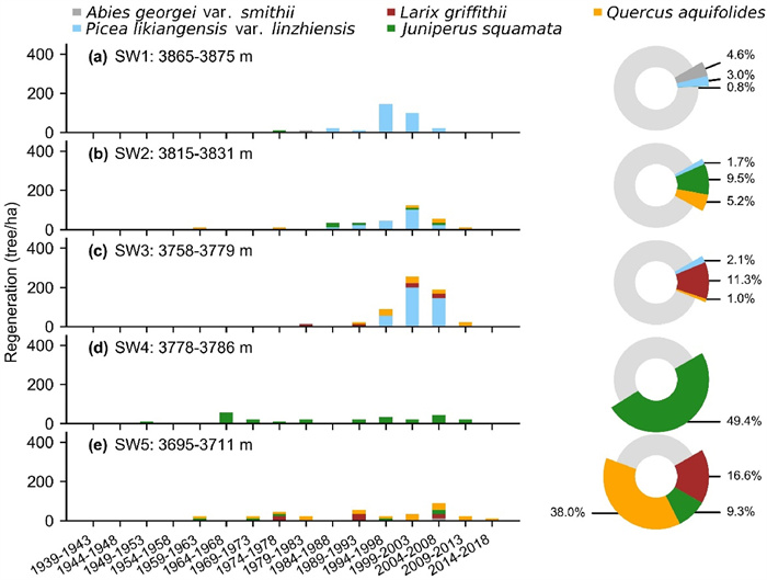 | Fig. 3 Tree regeneration after wildfire in five plots located at different elevations on a fir forest sampled in the Sygera Mountains, southeastern Qinghai-Tibet Plateau. |