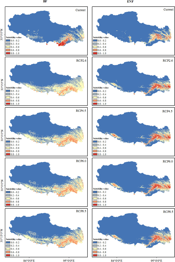 4.2. Consistent expansion of forest distribution under climate warming?Climate warming appears to be reshuffling the structure and demography of subalpine forests on the southeastern QTP. Simulations based on RCP2.6 and RCP4.5 scenarios indicate that subalpine conifer forests on the eastern QTP will expand from 2016 to 2096; in contrast, simulations using the RCP8.5 scenario indicate that these forests will begin to decrease around the same time (Liu et al., 2021). In fact, climate warming is triggering an upward shift of alpine fir treelines on the southeastern QTP (Liang et al., 2016). This field result is consistent with our simulations that the suitable area tends to decline under more extreme warming scenarios (evergreen needle-leaved forests at RCP4.5, broadleaved forests at RCP6.0). However, broadleaved trees seem to be more favored by climate warming and succession than subalpine conifers, which are showing growth declines due to stand encroachment (Cao et al., 2021).
