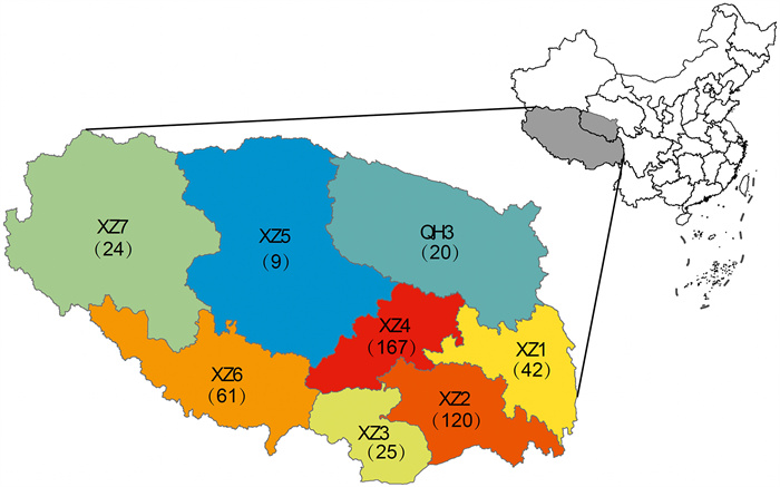| Fig. 1 Maps showing the geographic extent of the Qinghai-Tibet Plateau (QTP) defined in this study (upper-right) and its eight regions (lower-left). Numbers in parentheses are the numbers of naturalized angiosperm species. Codes for the regions: QH3 = Yushu Prefecture plus part of Haixi Prefecture, XZ1 = Changdu (Qamdo) Prefecture, XZ2 = Linzhi (Nyingchi) Prefecture, XZ3 = Shannan (Lhoka) Prefecture, XZ4 = Lhasa plus eastern part of Naqu (Nagqu) Prefecture, XZ5 = western part of Naqu (Nagqu) Prefecture, XZ6 = Rikaze (Shigatse) Prefecture, XZ7 = Ali (Ngari) Prefecture. |