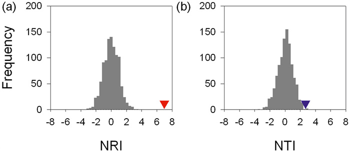 | Fig. 2 NRI (red triangle) and NTI (blue triangle) for all naturalized species on the QTP with respect to the species pool including all (native plus naturalized) angiosperm species on the QTP. Histograms for distributions of NRI and NTI values derived from null assemblages drawn from the same species pool. Each histogram represents the frequency of NRI or NTI values derived from 999 null assemblages randomly drawn from the species pool. |