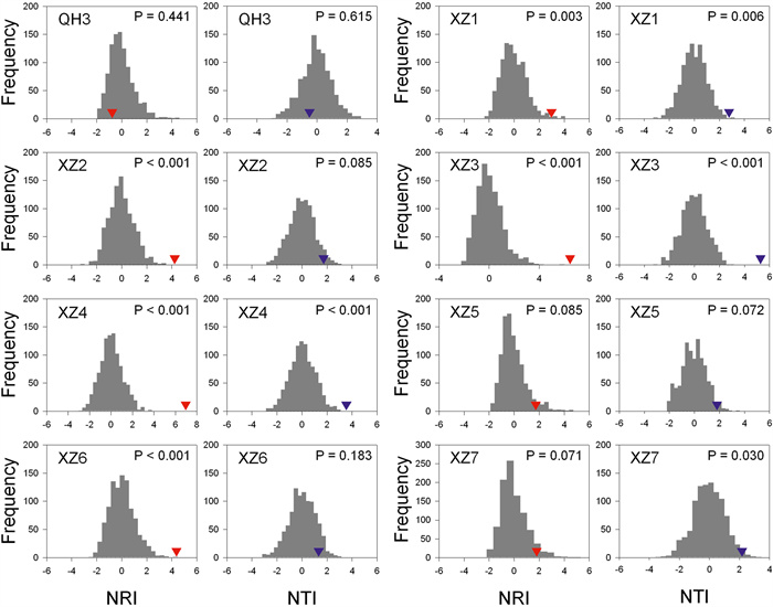 | Fig. 3 NRI (red triangle) and NTI (blue triangle), and their P-values, for naturalized species in each of the eight regions (QH3, XZ1 through XZ7) on the QTP with respect to the species pool including all (native plus naturalized) angiosperm species in the region. Histograms for distributions of NRI and NTI values derived from null assemblages drawn from the regional species pool. Each histogram represents the frequency of NRI or NTI values derived from 999 null assemblages randomly drawn from the regional species pool. See Fig. 1 for full names and geographic locations of the regions. |