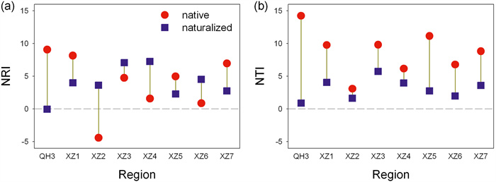 | Fig. 4 Comparisons of NRI and NTI between native and naturalized angiosperm species in the eight regions on the QTP. NRI and NTI for native and naturalized species in each region were calculated using the species pool including all native and naturalized angiosperm species on the QTP. |