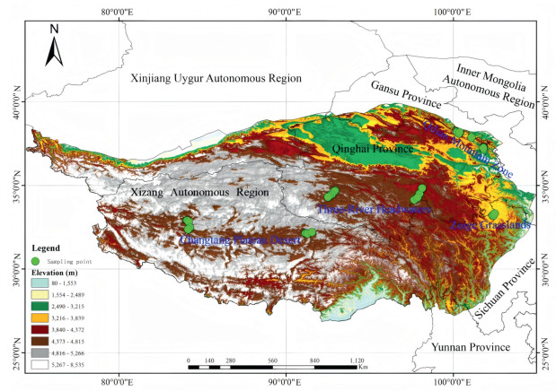 From July and August 2021, we conducted field surveys and sampling in four ecological functional zones: Qilian Mountain Zone, Three-River Headwaters, Zoige Grasslands, and the Changtang Plateau Desert. Field work corresponded to a period of vigorous plant growth and followed technical specifications for inventorying plant communities (Fang et al., 2009). We established two 1-km transects along different altitudinal gradients in different ecological functional areas. We then recorded environmental factors along each altitudinal gradient, including geographic location, terrain factors and disturbance levels. Three replicate subplots (1 m × 1 m each) were randomly selected at each altitudinal gradient, for which we recorded species names, species numbers, natural height, density and coverage of the plants in the subplots.