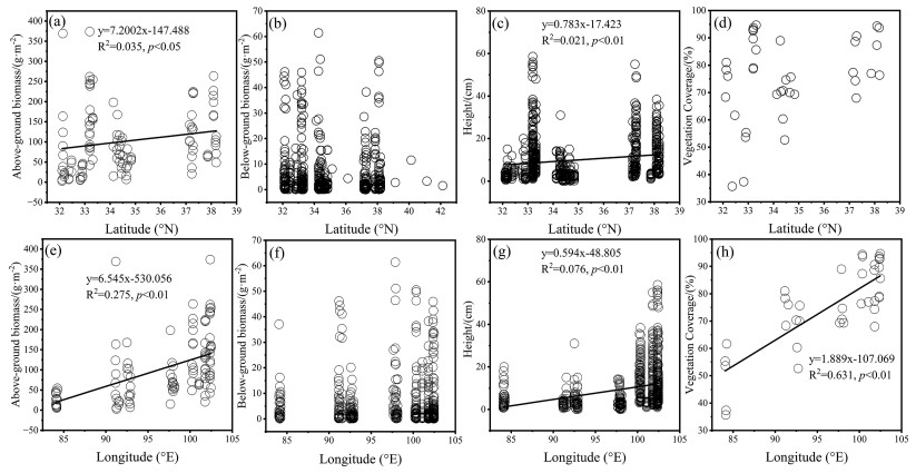 | Fig. 2 Patterns of plant productivity in the QTP grasslands along longitudinal and latitudinal gradients. Note: a, b, c, d, e, f, g and h represent AGB, BGB, H and VC changes with latitude and longitude, respectively. |