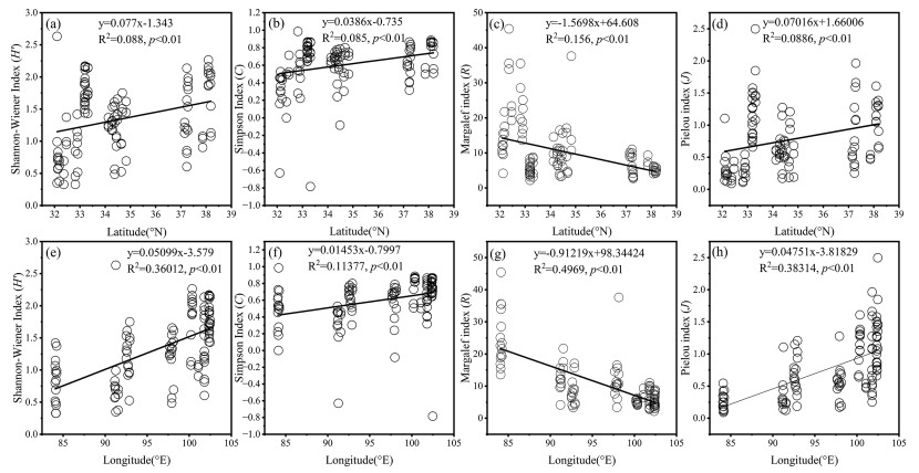 | Fig. 5 Changes in species diversity with latitude and longitude. Note: a, b, c, d, e, f, g and h represent Shannon–Wiener index, Simpson index, Margalef index and Pielou index changes with latitude and longitude, respectively. |