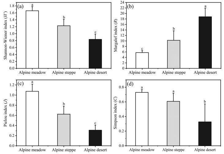 | Fig. 6 Changes in species diversity with different grassland types in the QTP. Note: Different lowercase letters indicate significant differences at the different grassland types (p < 0.05). |