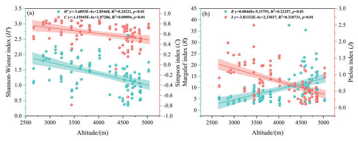 The Shannon–Wiener index (H') is mainly used to measure the level of community species diversity, and the Pielou index is used to measure the evenness of species distribution in the community. The formulae are as follows:
