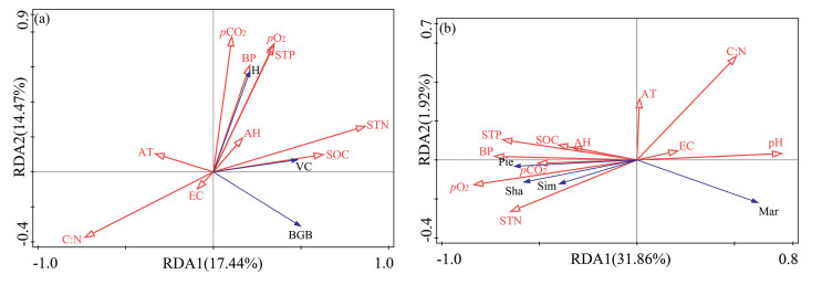 Redundancy analysis (RDA) showed that, out of all environmental factors examined STN, pCO2, AH and SOC were the main factors affecting the change in alpine grassland plant productivity, with contribution rates of 41.6%, 25.7%, 10.0% and 10.0%, respectively (p < 0.05) (Fig. 8a). Species diversity was affected most by pO2, AH and BP, with contribution rates of 62.5%, 11.9%, and 9.6%, respectively (p < 0.05) (Fig. 8b).