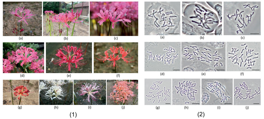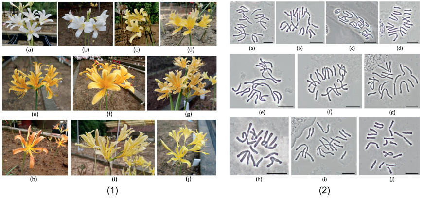 | Fig. 4 Flower morphology and chromosomes in 10 autumn-leaf emergence accessions. (1) Left: flower morphology; (2) Right: chromosomes correspond to the species on the left, bar = 20 μm. a) Lycoris wulingensis; b and c) L. haywardii; d and e) L. rosea; f) L. chunxiaoensis; g) L. hubeiensis; h) L. houdyshelii; i and j) putative natural hybrids 4 and 5. |