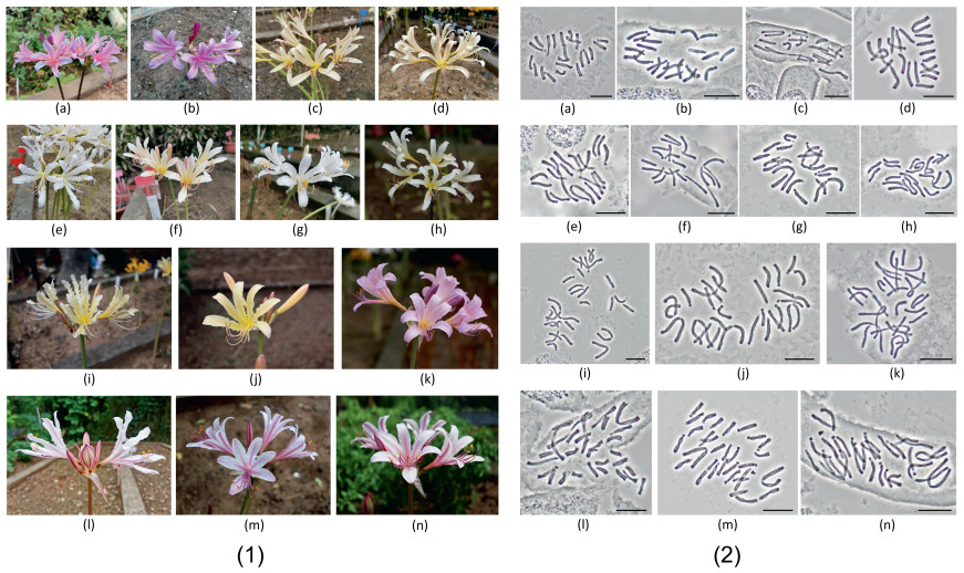 | Fig. 2 Flower morphology and chromosomes in 14 spring-leaf emergence accessions. (1) Left: flower morphology; (2) Right: chromosomes correspond to the species on the left, bar = 20 μm. a and b) Lycoris sprengeri; c and d) putative L. guangxiensis; e–h) L. × jinzheniae; i and j) L. caldwellii; k) L. squamigera; l) L. shaanxiensis; m and n) L. incarnata. |