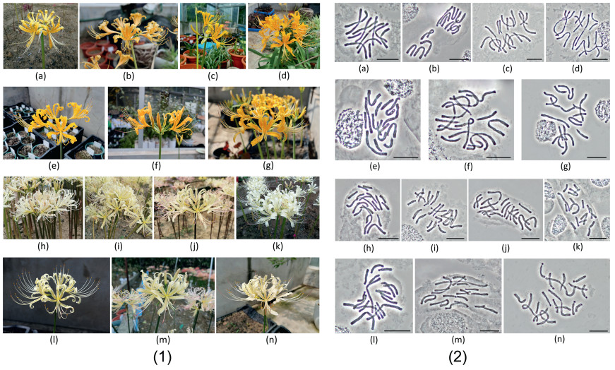 | Fig. 3 Flower morphology and chromosomes in 14 autumn-leaf emergence accessions. (1) Left: flower morphology; (2) Right: chromosomes correspond to the species on the left, bar = 20 μm. a and b) Lycoris traubii; c–g) L. aurea; h–k) L. straminea; l–n) L. albiflora. |