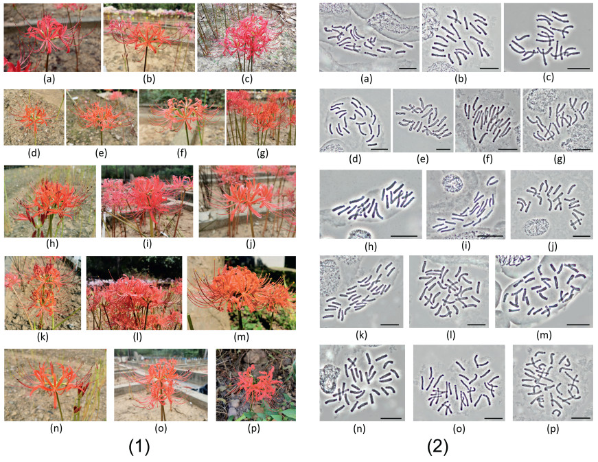 | Fig. 5 Flower morphology and chromosomes in 16 autumn-leaf emergence accessions of Lycoris radiata var. pumila and L. radiata. (1) Left: flower morphology; (2) Right: chromosomes correspond to the species on the left, bar = 20 μm. a–g) L. radiata var. pumila; h–j) L. radiata with chromosomes 2n = 22; k–p) L. radiata with chromosomes 2n = 33. |