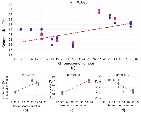 | Fig. 6 Correlation analysis between chromosome number and genome size in Lycoris. a) Statistics and correlation of chromosome number (x-axis) and genome size (y-axis) of 64 Lycoris accessions. The data for each dot are listed in Table 1. The blue dots represent the autumn-leaf emergence accessions, and the red dots represent the spring-leaf emergence accessions. b) Correlation of 20 aneuploid accessions (2n = 19, 27, 29 and 30). c) Correlation of 23 accessions with 2n = 22 and 33 chromosomes. d) Correlation of 35 diploid accessions (2n = 12, 14, 16 18, and 22). |