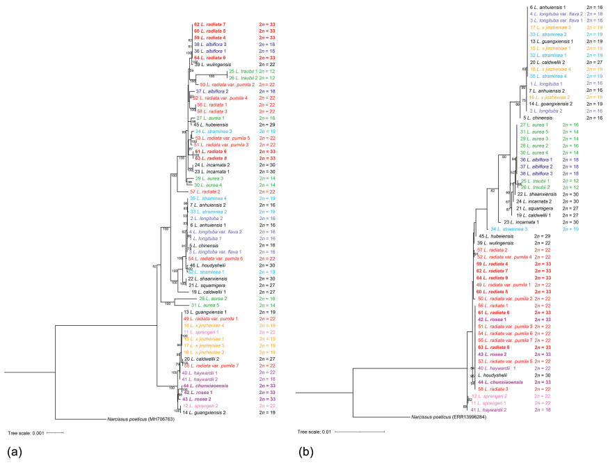 | Fig. 7 Maximum likelihood (ML) phylogenetic analyses of 59 Lycoris accessions based on (a) complete chloroplast genome sequences and (b) nuclear ribosomal DNA internal transcribed spacer (nrDNA ITS) sequences. Narcissus poeticus was used as the outgroup. Branch lengths are indicated along the branches; support values below 50 are not shown. Some species are highlighted in different font styles to clearly distinguish. |