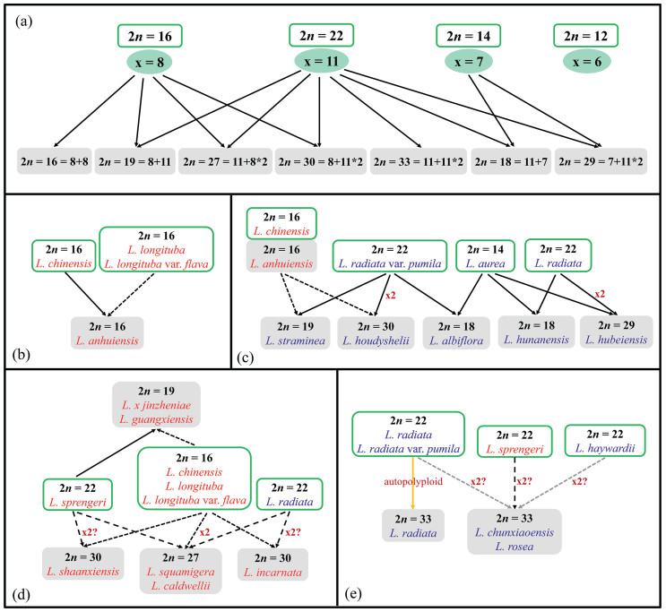 | Fig. 8 Putative pathway of speciation in Lycoris inferred from cytological and phylogenetic evidence. a) Putative chromosome compositions of hybrid species based on the chromosome base numbers of naturally distributed diploid species. b–e) Proposed parental combinations of hybrid species derived from cytological and phylogenetic analyses. Solid arrows indicate confirmed parental relationships, while dashed arrows represent hypothetical or possible parental sources. Green boxes represent naturally distributed diploid species, and gray-shaded boxes represent hybrid-derived species. Species names in blue and red fonts indicate autumn- and spring-leaf emergence species, respectively. "x2" indicates chromosome doubling events associated with hybridization. |