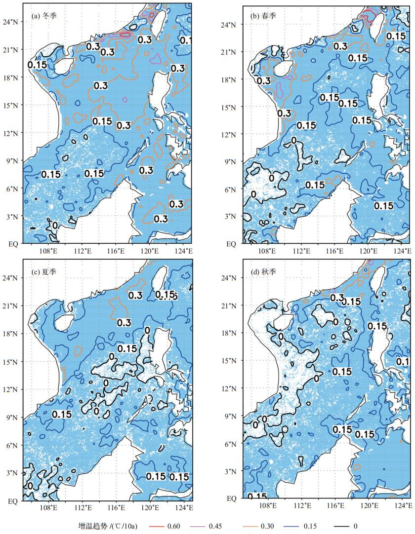 春季SST增温的高值区域主要集中在南海北部,特别是在台湾海峡和海南岛周围海域存在明显的高值中心。夏季南海增暖较为均匀,北部海温上升相对较大,但不存在明显的高值中心。从南海气候特征可知,夏季南海西部和越南东岸存在一个相对低温区,近30年夏季该海区SST呈上升趋势,可能导致该冷水区存在减弱的趋势。秋季的增温区主要分布在中国大陆沿岸附近,范围小但增幅较大,而南海的西部存在较大范围海温稳定或弱降温区域,其变化趋势未通过0.05的显著性检验。