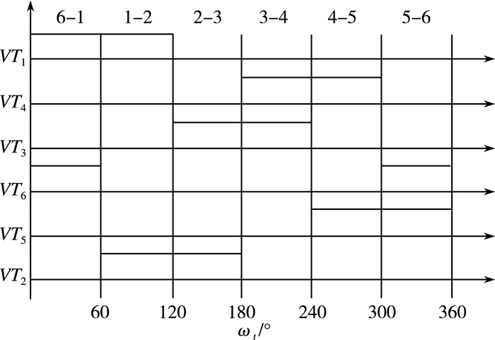 在BUCK电路来调节母线电压大小的基础上,原来三相逆变桥PWM信号控制的方式变为恒通控制,具体控制方式如图 3所示。每一次状态切换均采用恒通控制。
