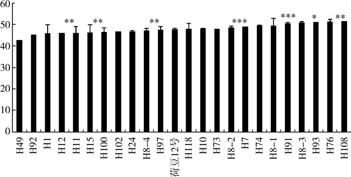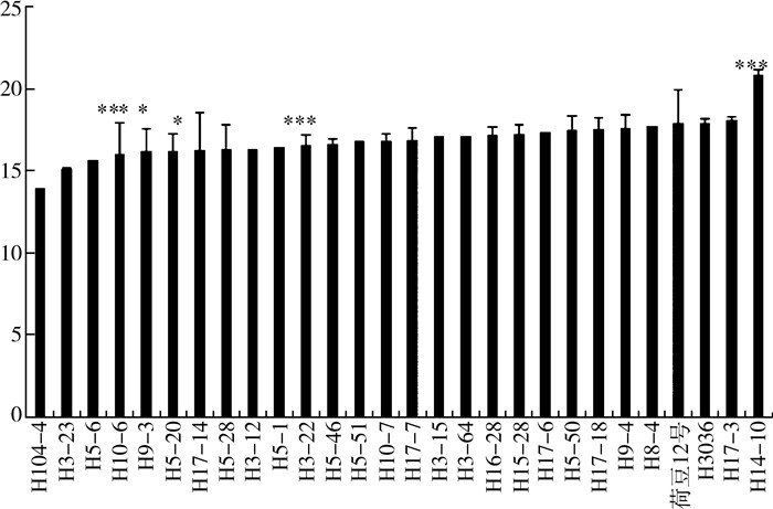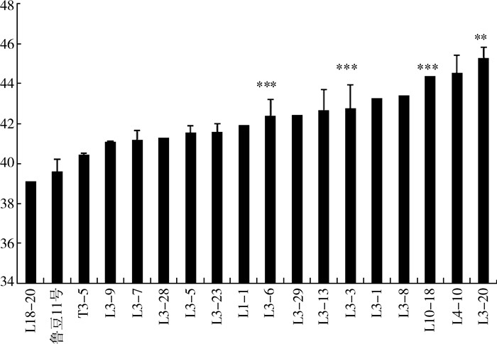 而在“荷豆12号”突变体M5代籽粒及“鲁豆11号”突变体的M5突变体籽粒及野生型的水溶性蛋白(干基)含量百分数均有下降,其中突变体籽粒中水溶性蛋白(干基)含量维持在25%左右,野生型则维持在17%左右。推测是由种植的环境因素及种子贮存问题造成。由表 4、表 5可知有99%的“鲁豆11号”M5代籽粒水溶性蛋白含量高于“鲁豆11号”,约71%的“荷豆12号”M5代籽粒水溶性蛋白含量高于相应野生型。